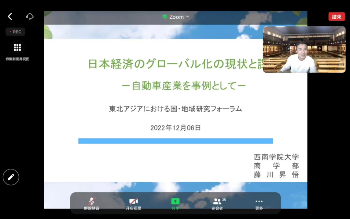 On December 6th, 2022, Professor FUJIKAWA SHOGO of the Faculty of Commerce of Seinan Gakuin University, Japan, delivered an online lecture on "Current Situation and Problems of Economic Globalization in Japan” at the invitation of the Northeast Asian Research Center of Jilin University, the Northeast Asian Studies College of Jilin University, the Institute of Japanese Studies of Jilin University, and the Special Committee for Northeast Asian Regional Studies, Academic Association for International Cultural Exchange. The lecture was hosted by Associate Professor Li Hongmei, Deputy Director of the Institute of World Economics, Northeast Asian Studies College of Jilin University