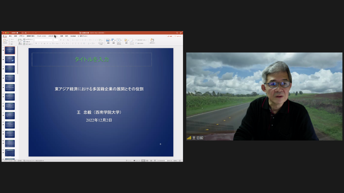 On December 2nd, 2022, Professor OH CHUGI of the Faculty of Commerce of Seinan Gakuin University, Japan, delivered an online lecture on “The Development of Multinational Corporations and Their Role in East Asian Economies” at the invitation of the Northeast Asian Research Center of Jilin University, the Northeast Asian Studies College of Jilin University, the Institute of Japanese Studies of Jilin University, and the Special Committee for Northeast Asian Regional Studies, Academic Association for International Cultural Exchange. The lecture was hosted by Associate Professor Li Hongmei, Deputy Director of the Institute of World Economics, Northeast Asian Studies College of Jilin University.