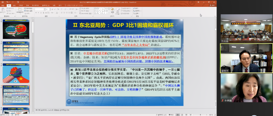 On November 23rd, 2022, the High-end Forum on The Changing Situation on the Korean Peninsula and South Korea's Foreign Policy was held at Jilin University. The lecture was jointly organized by the Northeast Asian Research Center, Northeast Asian Studies College and the Institute of Korean Peninsular Studies of Jilin University, and Special Committee for Northeast Asian Regional Studies, Academic Association for International Cultural Exchange. The Northeast Asian Studies College invited Professor Lee Sangman from the Institute for Far Eastern Studies of Kyungnam University, South Korea, to give the lecture. The lecture was hosted by Professor Zhang Huizhi, Deputy Director of the Northeast Asian Research Center and Director of the Institute of Korean Peninsular Studies of Jilin University, with the participation of faculty and students of Northeast Asian Studies College both online and offline. At the beginning of the lecture, Professor Zhang Huizhi extended a warm welcome to Lee Sangman on behalf of Professor Wu Hao, Dean of Northeast Asian Studies College of Jilin University.