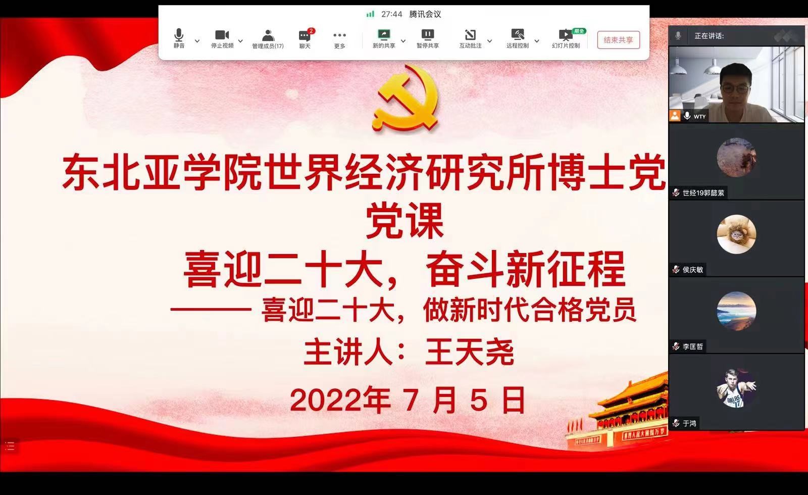 历史与文化研究所博士学生党支部书记刘颜青以 “做新时代不忘初心的合格党员,以优异成绩迎接党的二十大召开”为题讲党课,世界经济研究所博士学生党支部书记王天尧以“喜迎二十大,做新时代合格党员”为题讲党课,带领大家加深对党员身份的理解,号召大家把自己的人生理想与祖国、与时代紧紧联系在一起,做新时代的社会主义事业建设者和接班人,以更强的历史责任感和使命感,不负党对年轻人的无限厚望,让青春与党同行。