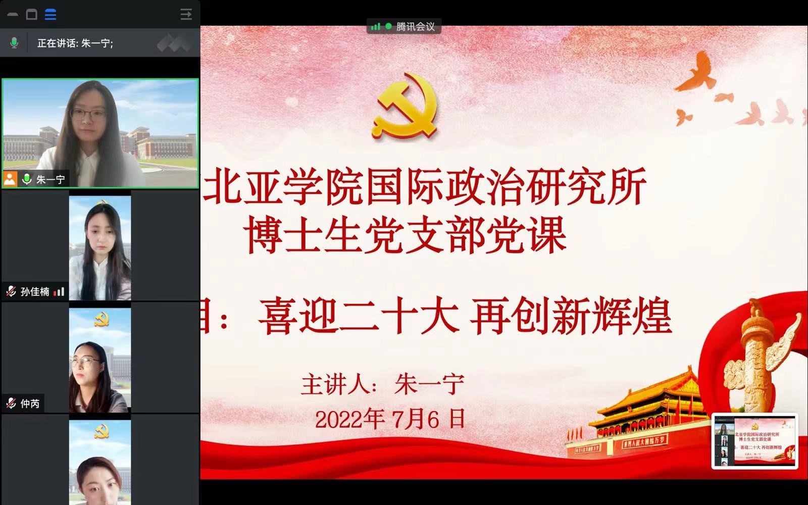 人口资源与环境研究所博士学生党支部书记尹豆豆以“坚定理想信念,坚守精神追求”为题讲党课,引导大家在社会课堂中“受教育、长才干、作贡献”,坚定信念听党话、跟党走。国际政治研究所博士学生党支部书记朱一宁以“喜迎二十大,再创新辉煌”为题讲党课,带领支部党员回顾了十九大以来我们党取得的突出成就,更加坚定了的理想信念。