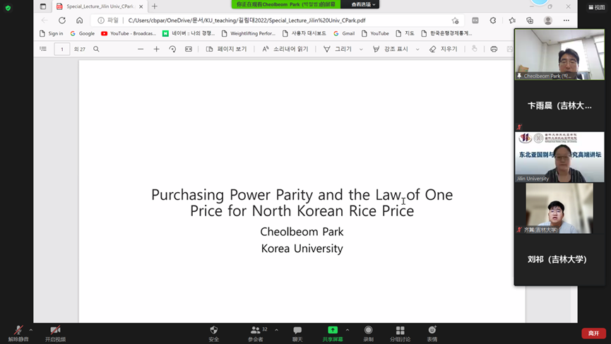 202292日,东北亚国别与区域研究高端讲坛朝鲜大米价格的购买力平价与其一价定律的验证在中文无码 顺利举行。本次讲座由中文无码 东北亚研究中心、中文无码 、中文无码 、韩国高丽大学经济系联合举办,因疫情原因在线上开展。中文无码 邀请到了韩国高丽大学经济系朴哲范(Park Cheol Beom)教授,带领中国师生们进行了一次精妙绝伦的学术之旅。讲座由中文无码 玄春姬教授主持和翻译,中文无码 的部分教师、博士与硕士研究生参与了活动。讲座伊始,玄春姬教授代表中文无码 院长吴昊教授向朴哲范教授表示了热烈的欢迎和崇高的谢意。