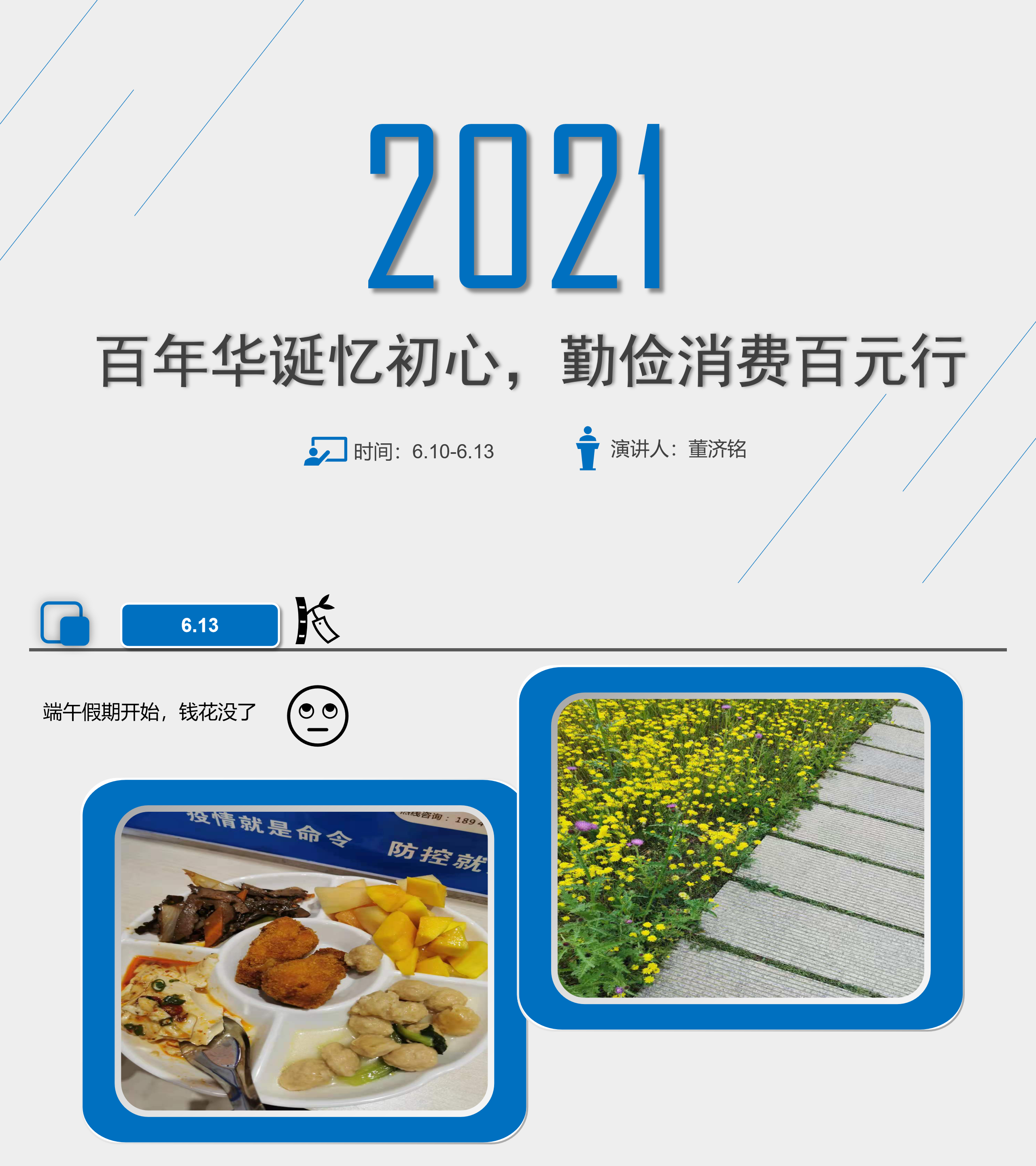 本次活动规则为2021年6月8日至6月15日,选择任意连续4天用100元进行中文无码 校园生活,并且尽可能地丰富多彩,可涉及到饮食、交通、学习、运动、娱乐等多方面;实际消费情况采取图片或者视频等方式进行记录最终做成PPT或vlog等形式进行展示。通过评选确定了6名同学的作品获奖。