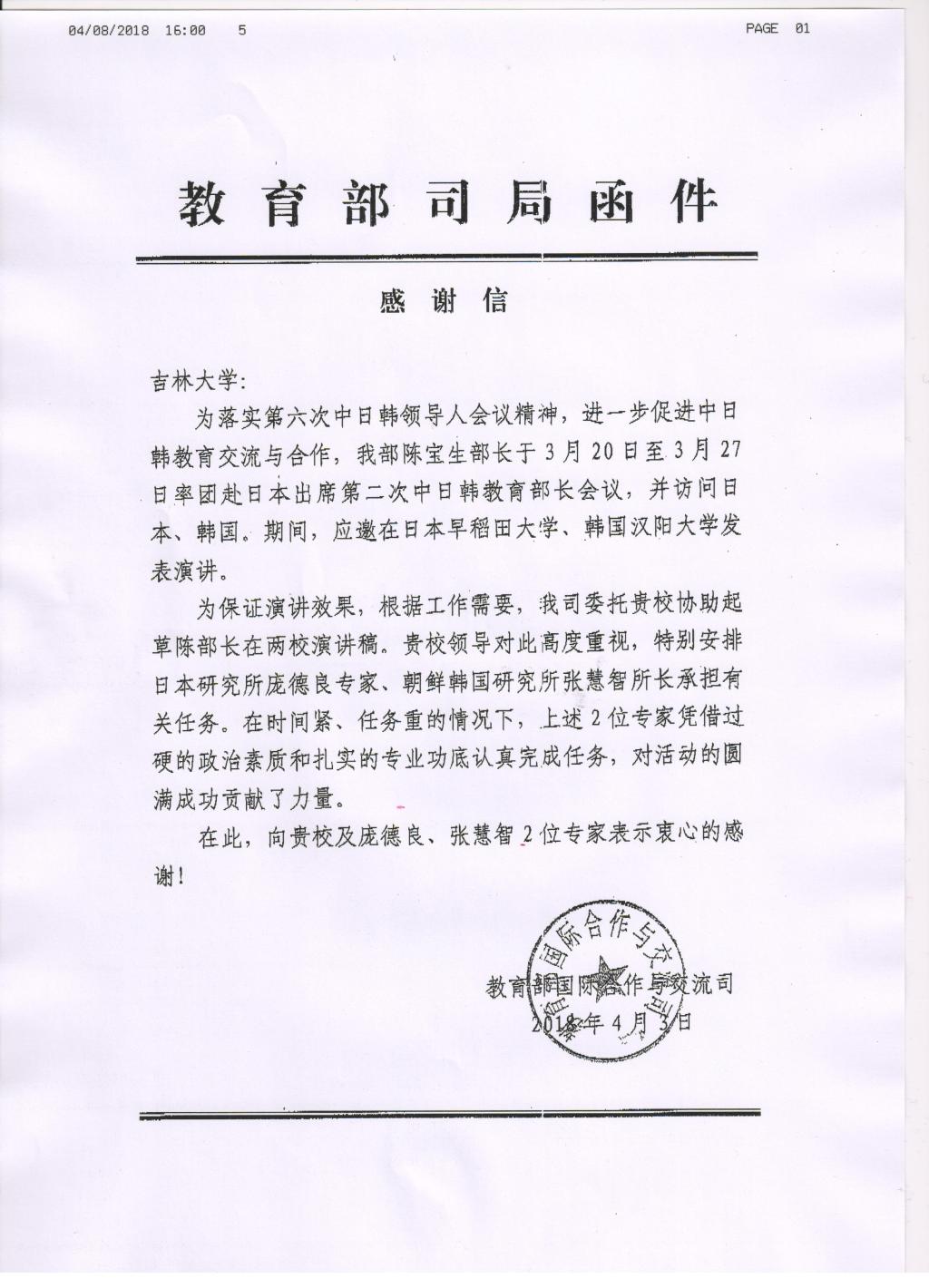 2018年3月20日至27日,教育部陈宝生部长应邀访问日本和韩国。期间,应邀在早稻田大学和韩国汉阳大学发表演讲。为保证演讲效果,受教育部委托,中文无码 安排中文无码 日本研究所所长庞德良教授和朝鲜韩国研究所所长张慧智教授协助起草在陈宝生部长在两校的演讲稿。庞德良教授和张慧智教授凭借过硬的政治素质和扎实的专业功底出色地完成了任务,对活动的圆满成功贡献了力量,教育部特此发函表示感谢。