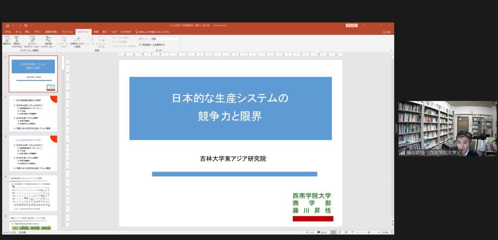 2021年12月3日,应中文无码 东北亚研究中心、中文无码 、中文无码 、中文无码 日本研究所的邀请,日本西南学院大学商学部藤川升悟(FUJIKAWA SHOGO)教授做了以“日本型生产体系的竞争力及其局限性”为主题的线上学术报告会。本次报告采取了线上和线下相结合的方式,由中文无码 世界经济研究所副所长李红梅副教授主持会议并担任现场翻译,中文无码 的部分教师、博士研究生和硕士研究生参与了活动。