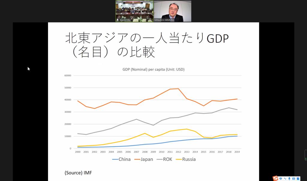 2021年12月15日,应中文无码 东北亚研究中心、中文无码 、中文无码 、中文无码 日本研究所的邀请,日本环日本海经济研究所调查研究部主任研究员、日本东北亚学会三村光弘(MIMURA MITSUHIRO)会长,做了以“东北亚区域合作必要的基本要素—以平等互利为基础的横向关系为目标—”为主题的学术讲座。本次讲座采取了线上和线下相结合的方式,由中文无码 王彦军副院长致辞、主持和翻译,中文无码 的部分教师、本科生和硕士研究生参与了活动。