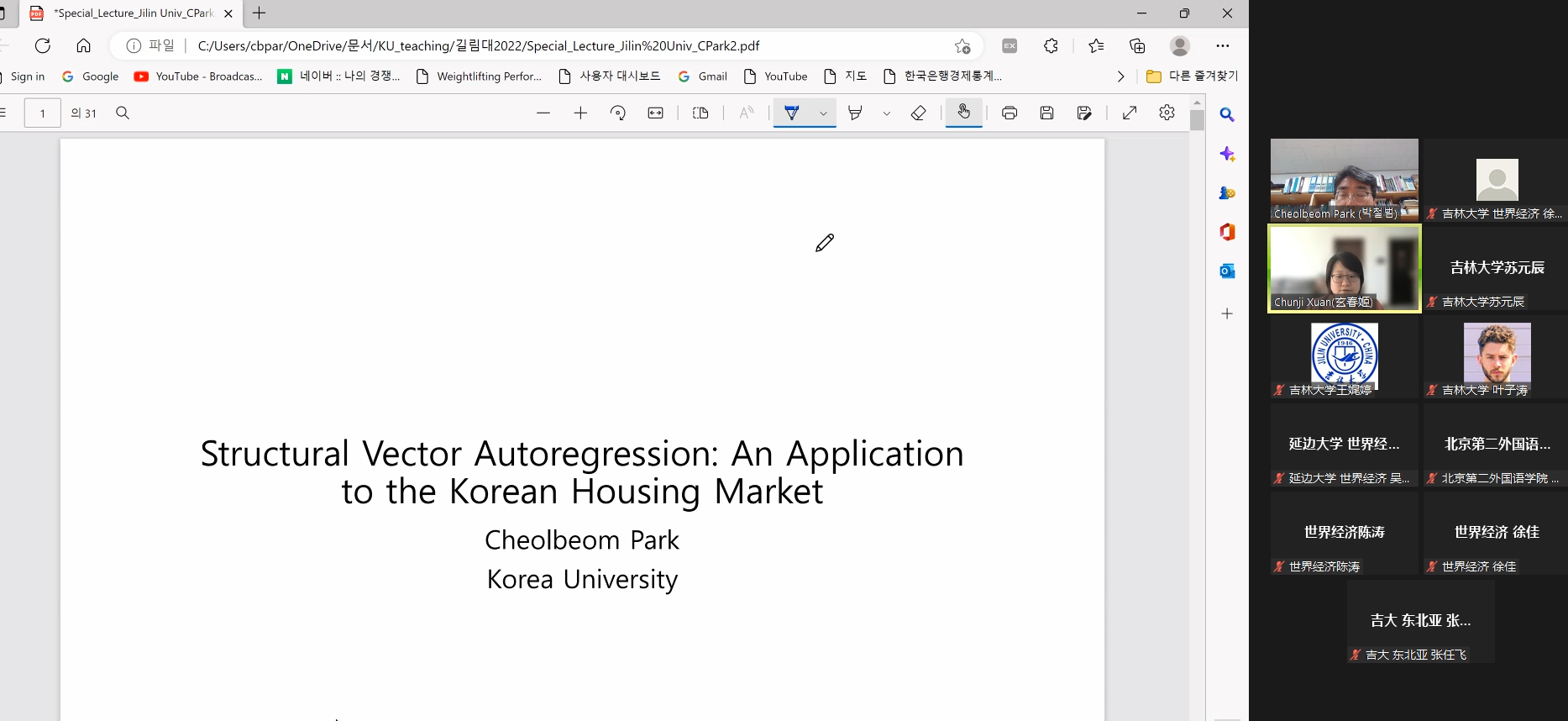 2022年12月9日,“东北亚国别与区域研究高端讲坛”之“结构向量自回归—对韩国房地产市场的应用”在中文无码 顺利举行。本次讲座由中文无码 东北亚研究中心、中文无码 、中文无码 、国际文化交流学术联盟东北亚区域研究专门委员会联合举办。中文无码 邀请到了韩国高丽大学经济系教授——朴哲范(Park Cheol Beom)教授来进行讲座。讲座由中文无码 副教授玄春姬主持。