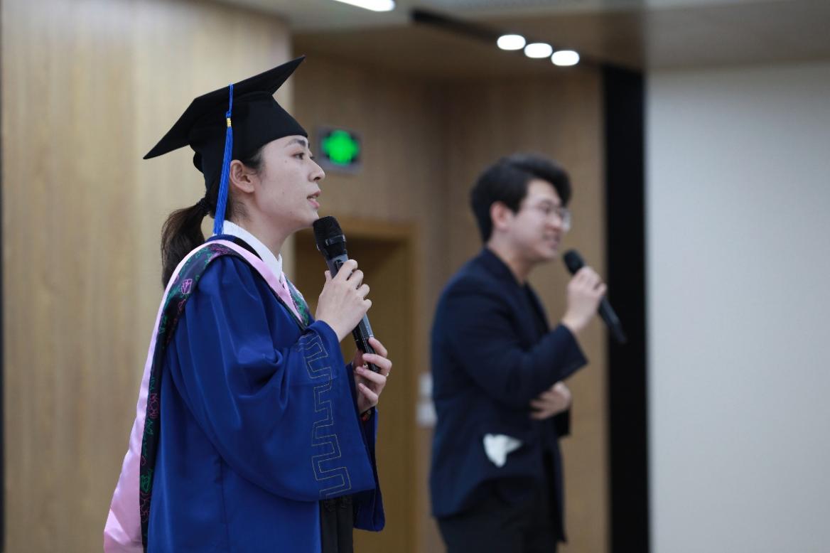 导师代表侯健明老师首先对在场的毕业生表示祝贺,恭喜他们顺利通过课程考试和论文答辩获得学位。他回忆了与同学们的点点滴滴,希望各位毕业生能够带着这些经历与教诲,创造自己的未来。最后,他期待同学们学以致用、拥抱挑战、不断进步,尽快得到社会的认可。