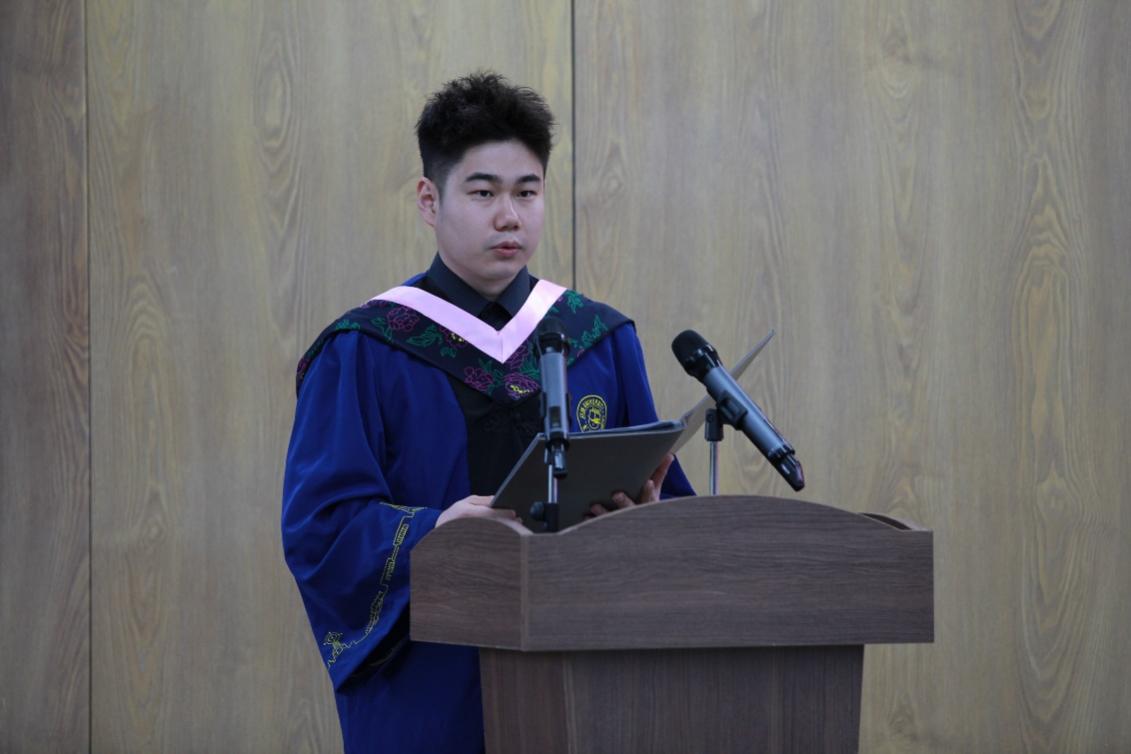 宝崇峰同学首先对学院老师、同学送上真挚的感谢,并祝贺在场的同学为三年的勤勉时光画上圆满的句号。接下来,他基于对“求成者”的理解,阐述了对走出校门之后生活的自我要求和期望,希望与在场同学共勉,一起成长为勇敢逐梦、新时代能担重任、可堪大用的有志青年。