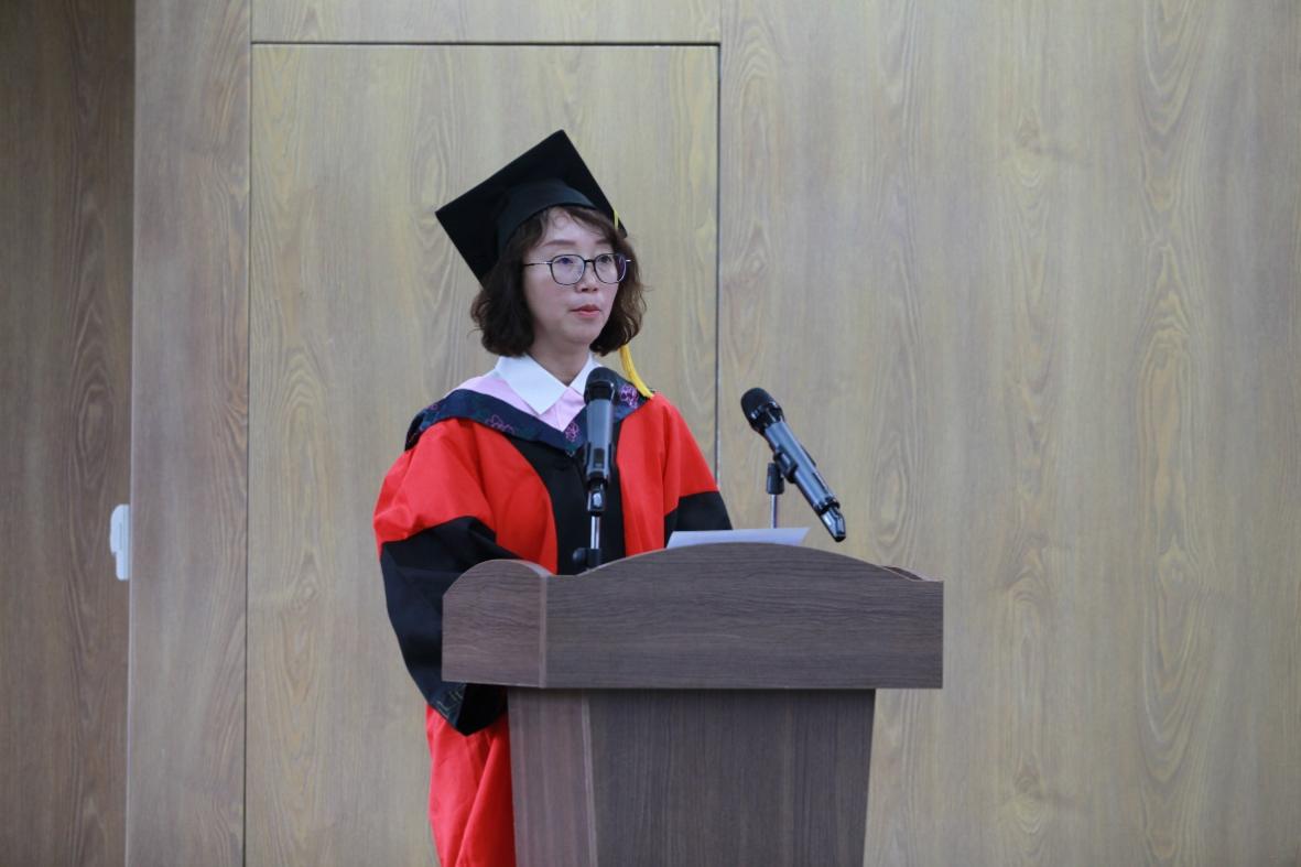 典礼第四项,陈英姿副院长宣读授予学位决定,崔健老师、巴殿君老师、张慧智老师、陈英姿老师、吴昊院长为毕业生授予学位并进行拨穗仪式。