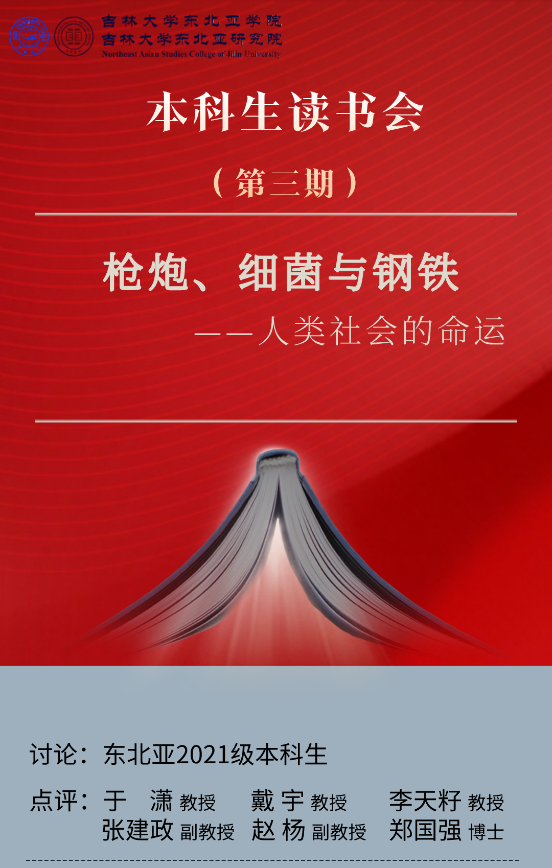 在线上举办了第三期本科生读书会,本次读书会的主题是讨论美国学者贾雷德.戴蒙德的畅销书籍《枪炮、病菌与钢铁:人类社会的命运》。