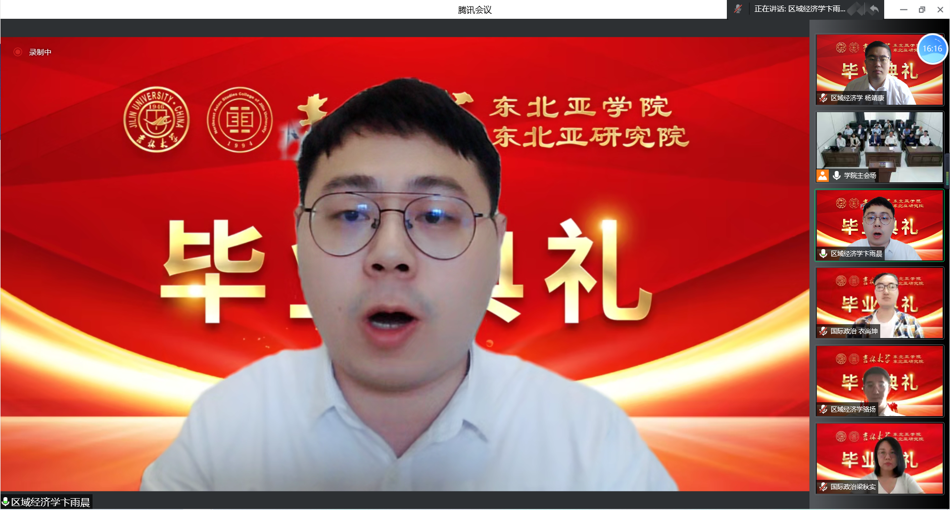博士毕业生代表梁秋实同学和硕士毕业生代表卞雨晨同学都表达了对学院和老师们感恩之情,表达了对同窗之间深厚情谊的不舍之情,并表示会牢记“求实创新,励志图强”的吉大精神,牢记老师们的谆谆教诲,无论未来去往何处,都会展现吉大人,展现东北亚学子的风采。