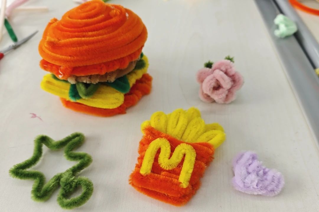 活动组织者为同学们准备了材质各异、色彩多元的扭扭棒,同时为了充分满足同学们的自由创作需求,还采购了包装纸、花架、小眼睛和钻石贴纸等材料。制作过程中,同学们各取所需、专心致志地创作属于自己独一无二的扭扭棒作品。有的同学由于制作得较好,被大家自发地当成了“小老师”,同学们围坐在一起交流讨论、互相帮助,以自己当下的状态和情绪为依托,伴随着平和放松的轻音乐,共同“扭出”自己想象中的作品。